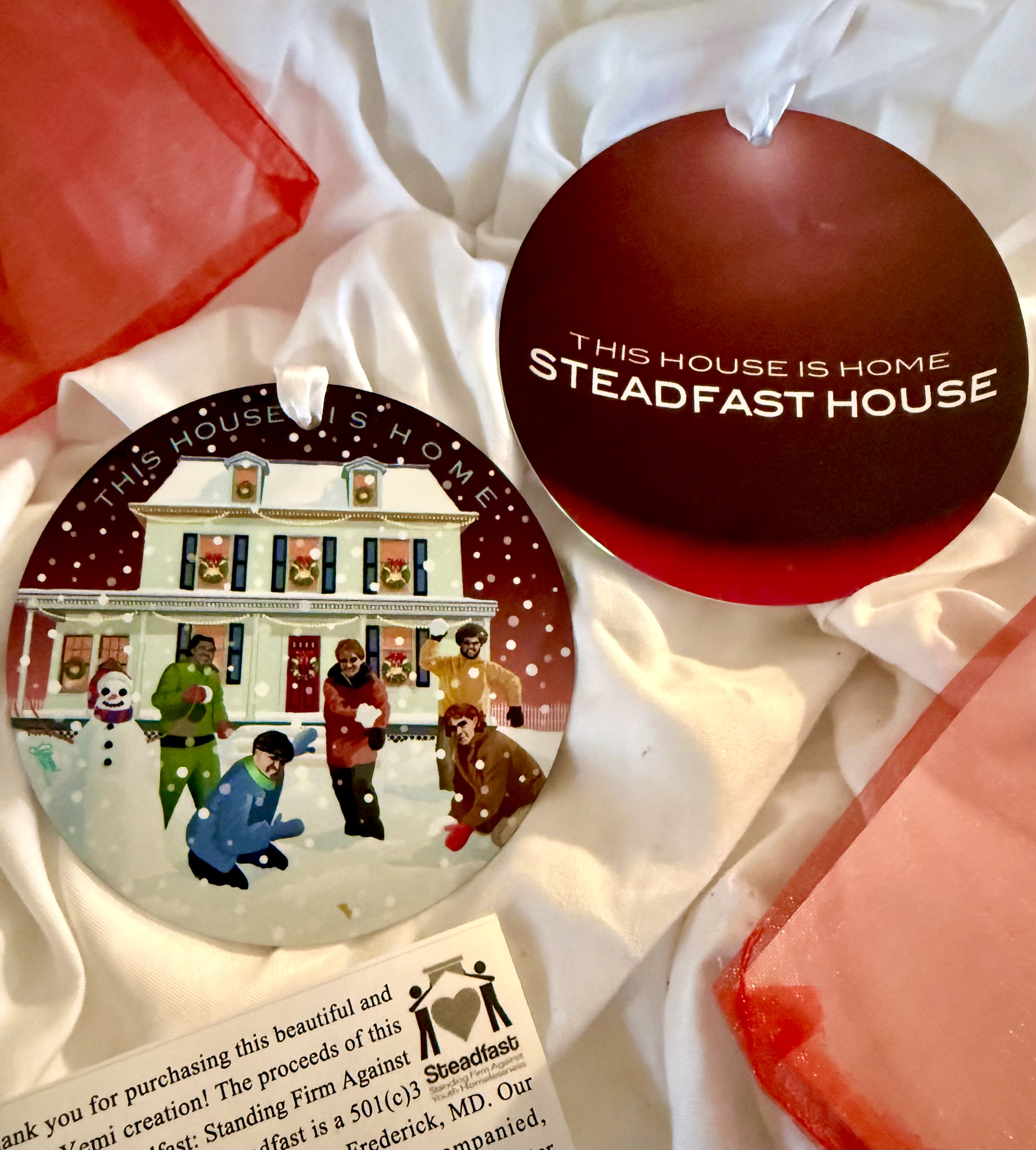 One-of-a-kind 2025 edition Christmas item, created specifically for Steadfast by Frederick's own renowned artist, Yemi. The metal ornament features likenesses of our treasured youth enjoying a snowball fight outside of the Steadfast Home. 2025 designs will be retired at the end of the season. All proceeds benefit Steadfast, Standing Firm Against Youth Homelessness - a 501(c)3 non-profit located in Frederick, whose mission is to provide housing in a caring, stable and home-like environment for homeless youth and youth transitioning out of foster care. PLEASE NOTE: Local pick up available. Price includes Shipping + Handling. Items shipped within 5 business days of purchase may not arrive in time for Christmas.